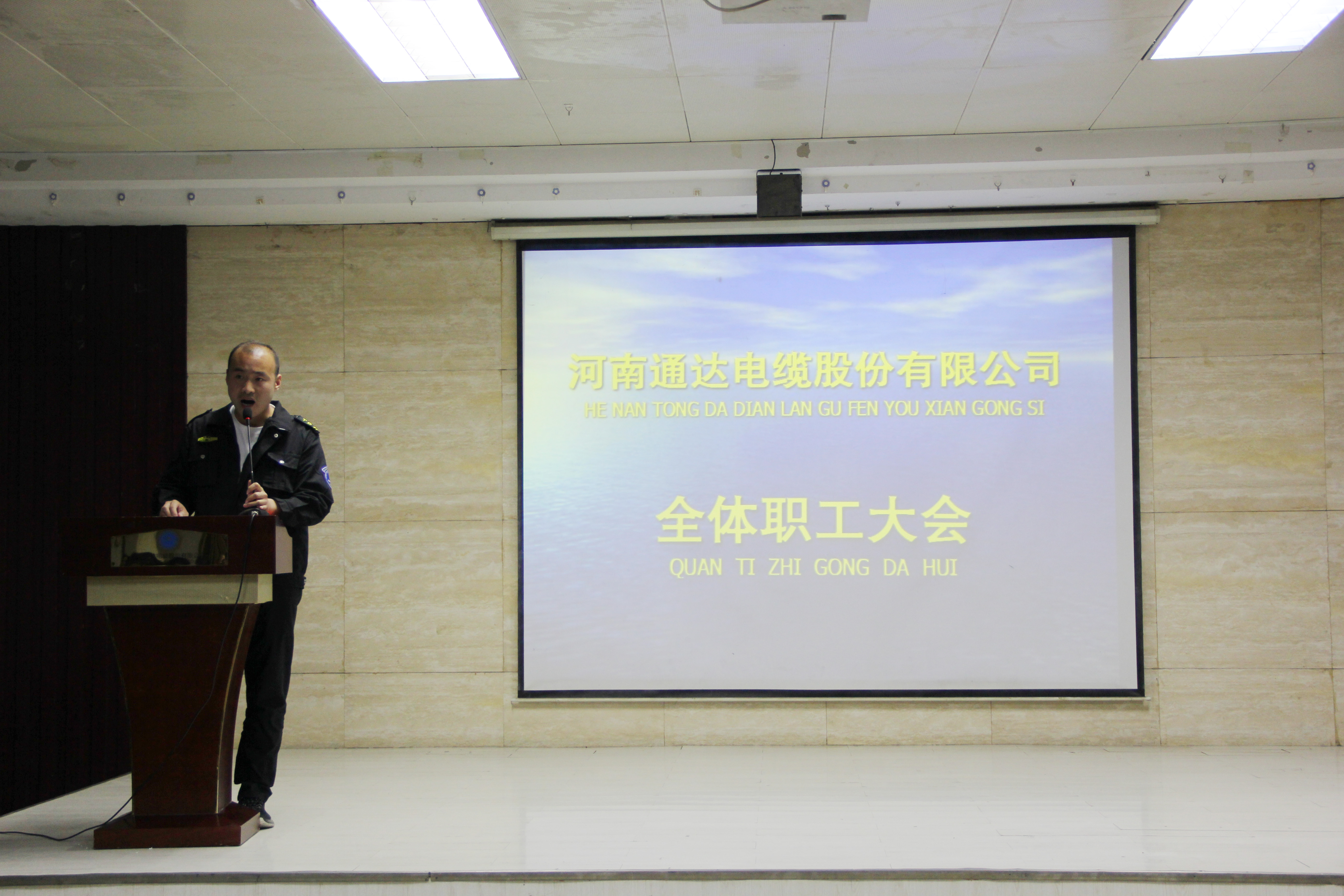 總經理曲洪普在會議上首先對新材料公司發生的軋機失火事故進行了通報,再次強調了安全生產的重要性。其次針對電纜車間下一步的工作做了重點安排,從提高工作效率、優化人員配置、提升操作水平、創新生產工藝、降低生產成本等方麵提出了要求,並鼓勵廣大員工推薦熟練操作工到公司工作,公司在提高自身硬件設施的同時,要加強各種人才的引進和培養工作。曲總還呼籲大家愛護公共財物,人人從自身做起,從身邊小事做起,養成良好的個人習慣,共同構建公司舒適的工作、生活環境。
