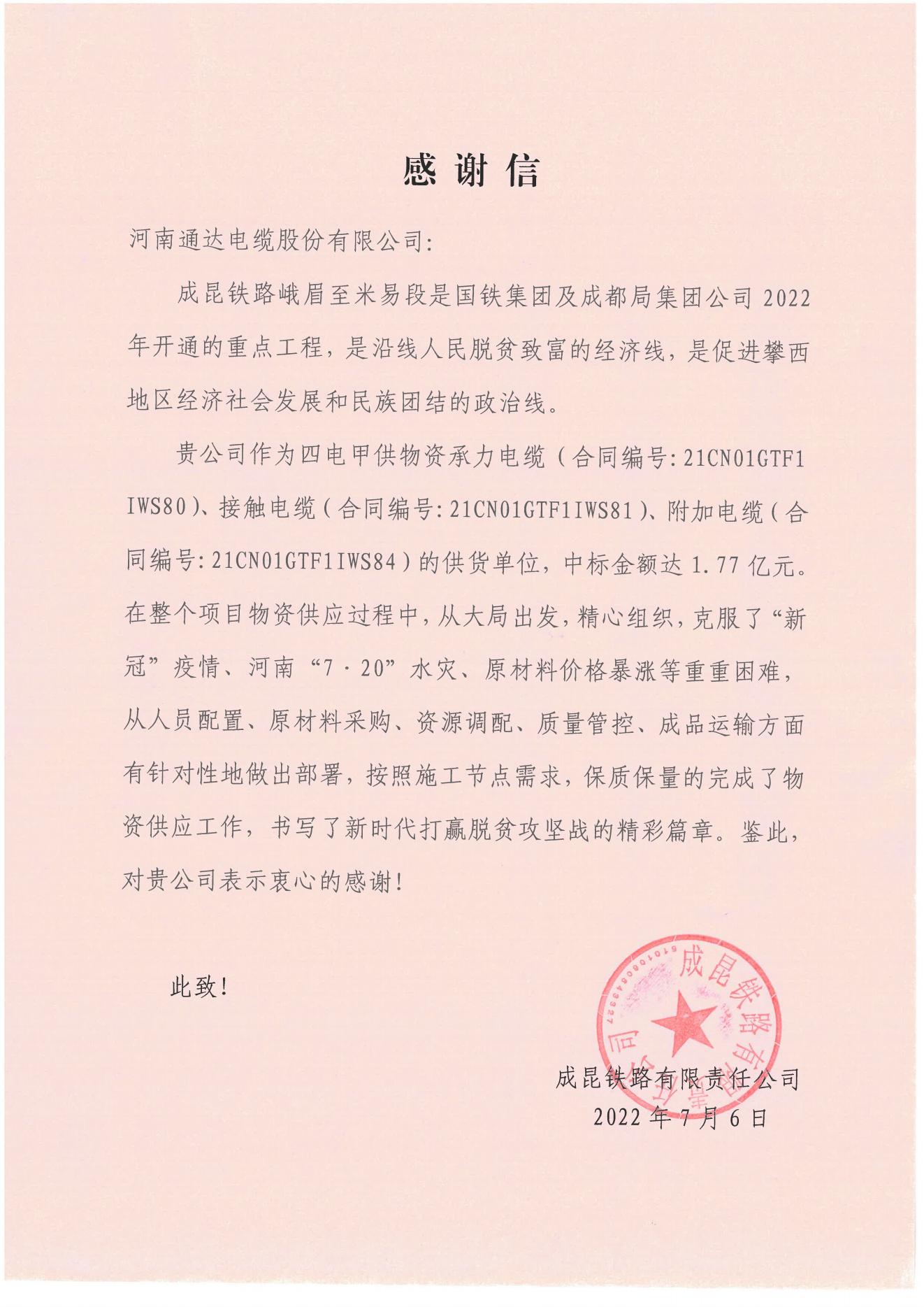 為此,成昆鐵路公司於7月6日給我公司發來了感謝信。