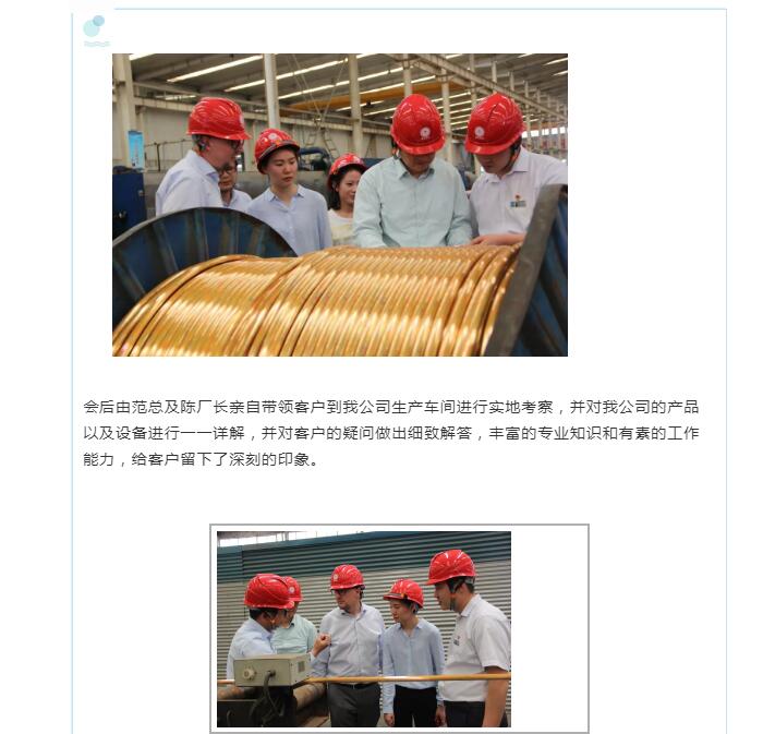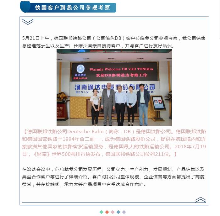 5月21日上午,德國聯邦鐵路公司(公司簡稱DB)客戶蒞臨我公司參觀考察,我公司銷售總經理範雲生以及生產廠長陳少國親自接待客戶,並與客戶進行友好洽談。
